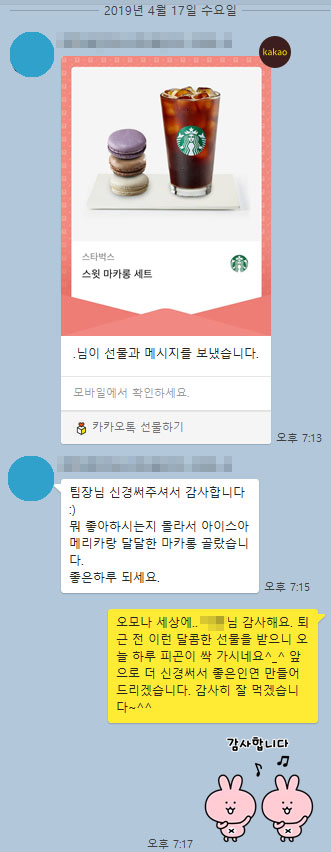팀장님 신경써주셔서 감사합니다 :) 뭐 좋아하시는지 몰라서 아이스아메리카랑 달달한 마카롱 골랐습니다. 좋은하루 되세요. 회원님이 보내주신 감사선물입니다. The Class is here, BEST CLASS