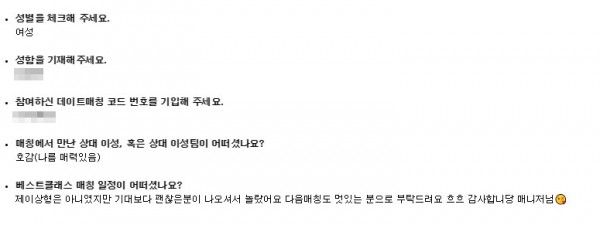 제 이상형은 아니었지만 기대보다 괜찮은 분이 나오셔서 놀랐어요. 다음 매칭도 멋있는 분으로 부탁드려요 흐흐 감사합니당 매니저님… 회원님이 보내주신 만족도 조사입니다. The Class is here, BEST CLASS